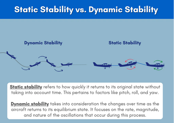 - Positive dynamic stability: the over time response of the aircraft to return to the original state of equilibrium after being disturbed.